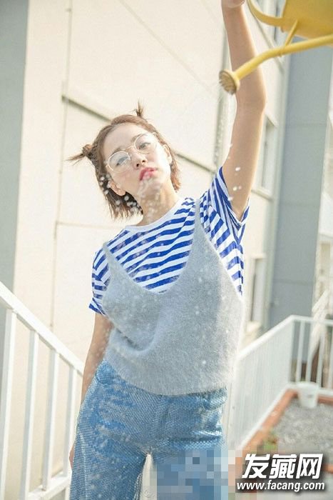 阚清子的短发造型,齐脖短发带着一点妩媚和帅气感,日常扎双丸子头可爱又减龄。