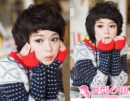 青春可爱风——蓬松的短发纹理烫,自然的黑色,文静大方,圆形弧度的刘海修饰精致完美的脸型,糖果的妆容更显少女的魅力。