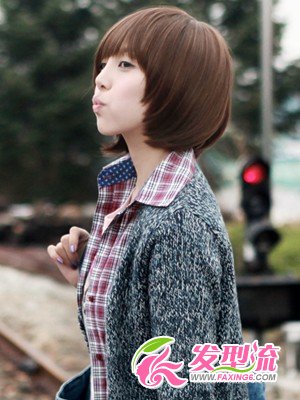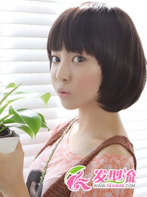 修剪成圆形弧度的造型,纯黑的发色展现出MM清纯的气质。搭配清新的妆容令造型更加清新,齐刘海设计很是可爱哦。