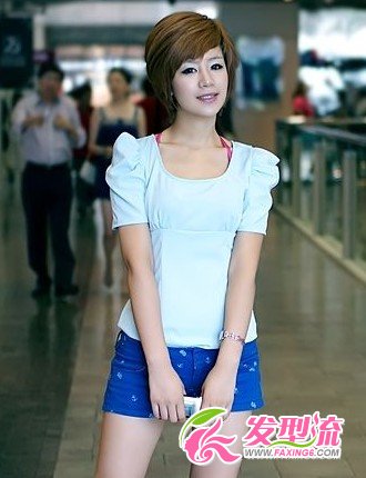 侧分的短发发型,刘海的长度和耳鬓的发丝呼应,打造出自然和谐。棕色的时尚发色突显出青春阳光。