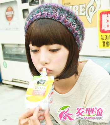 黑色的发丝显现出女生最天然的纯真,两侧发尾贴合下巴,勾勒出优美的轮廓线条。齐刘海修剪出不规则的微锯齿形,让发型更显魅力。在冬天,帽子是必不可少的装扮单品,利用彩色针织帽搭配发型,更有打造小V脸的效果。