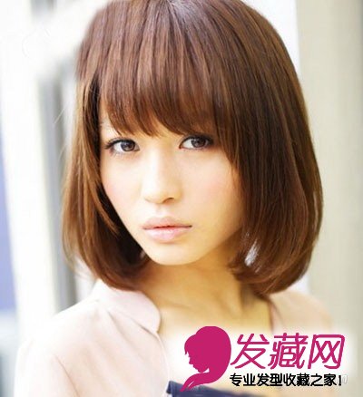 很适合长脸MM的发型,利用长长的刘海遮盖额头,两边是内扣弧度的发尾,打造出了娇小的脸型,暖色系的发色更显知性优雅。