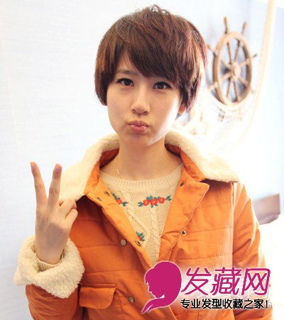 将厚厚的齐刘海微微斜分,给人感觉甜美清新,头顶厚厚的短发使整个发型更加饱满有型,棕色的发色是这款发型更具时尚感。