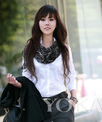 干练的白衬衣,花色的围巾让整个人没有那么单调,卷发的运用正好可以让整个人都没有那么的沉闷。