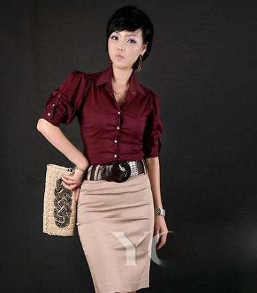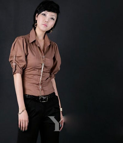 本身是全部都盖住耳朵的短发 ,可是因为大泡泡袖衬衣,所以把短发收整的更加整齐,不妨利用一些美发固定的产品,这样会让整个人看起来更加的干练。