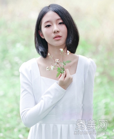 bob式发型,剪到颈部的长度,简约大方,黑色的发色,女孩的纯净美好。