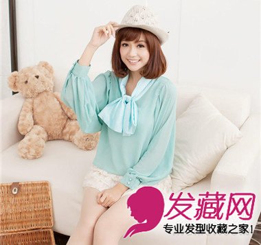 甜美系改良波波头卷发,发尾卷度内收,淡蓝色雪纺衫清新婉约,可爱的公主范儿
