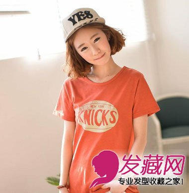 韩式中分栗色短烫卷发,搭配棒球帽和橘色T,很青春活力的感觉