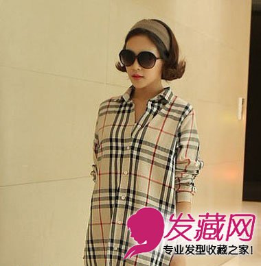 简单低调的韩流街拍,外翻式短卷发,俏皮的卷度,发带和格子衫搭配清新简约