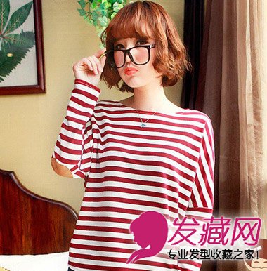 韩系栗色空气感齐刘海短卷发,红白双色海军条纹宽松长袖T恤清新甜美