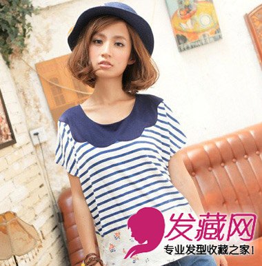 撞色拼接碎花波点T恤,栗色蓬松短发搭配同色系的帽子,清纯可爱