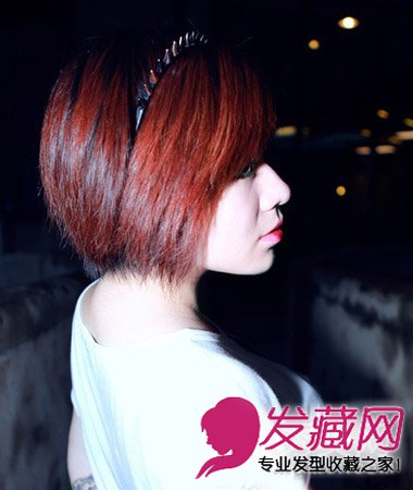 酒红色的染发颜色是很多潮范儿MM的大爱,干净利落的波波头短发搭配发饰,朋克味十足。