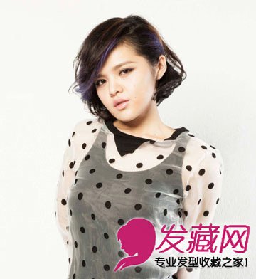 一头内扣系的短发烫发造型时尚吸睛,用斜分的长刘海修饰圆脸,加上紫色挑染,倍添潮流范。