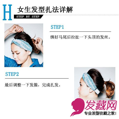 step1:将头发绑成马尾后戴上头巾,再轻轻拉扯下头顶的头发。