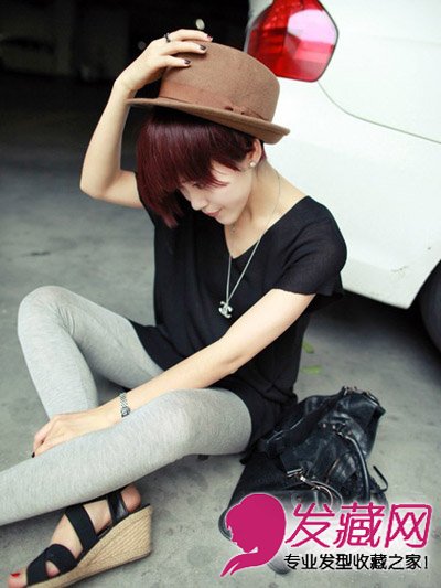 显示女生个性独特的一面,酒红色的发色让发型增添了无限的时尚感,帅气的女生帽以及休闲的女生凉爽服饰都是整个造型的完美展示哦,喜欢这款发型的你不妨来尝试。