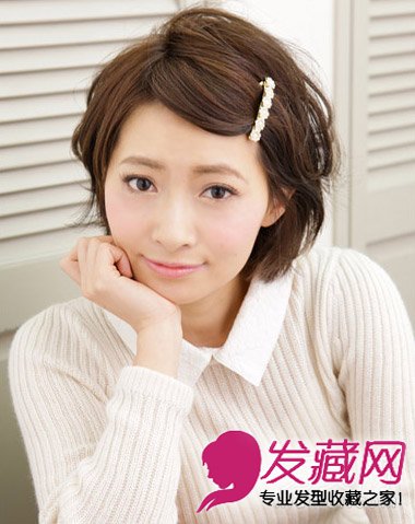 蓬松的短发修饰得头型更加饱满圆润。侧分长刘海用水晶发夹固定起来,勾勒出唯美的弧度,露出额头清爽又可爱。