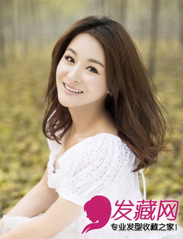 如果发量少也没关系,可以烫出微卷造型,丰盈的发丝,甜美的棕色发色,打造出知性感十足的中长发,适合圆脸的偏分也很恰当。