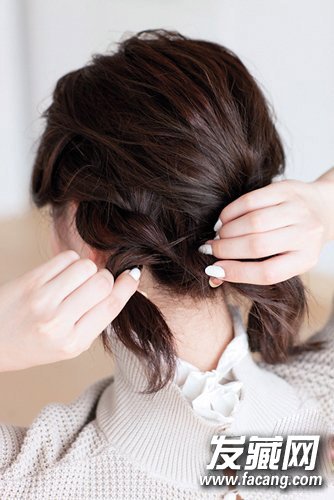 3,将左右耳朵上方的头发沿着脖颈各自向后拧起,把发梢翻折进内侧来固定。