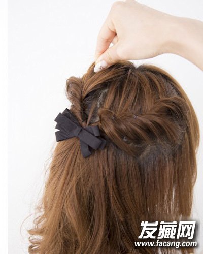 同样在左边抓出一股头发扭转固定,把两边头发用蝴蝶结发饰别上,最后拉松头发,制作蓬松效果。