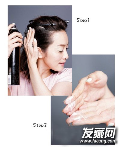 STEP1:将头顶发夹起,两侧用手压服贴后,喷上定型发胶固定。
