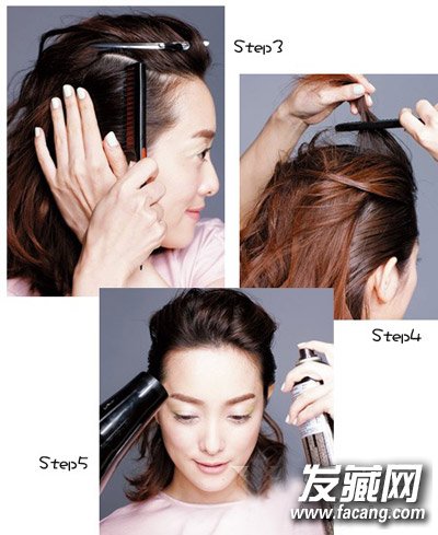 STEP5:头顶喷上定型发胶后,用吹风机热风档向后吹1分钟,帮助最终定型。