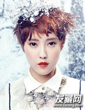 这一款个性的写真发型也是不错的选择哦,时尚的黄棕色发色加上时尚的碎发发型勾勒出无比的潮流气质, 点缀上发色加上复古妆扮的点缀颇有个性的一款短发。