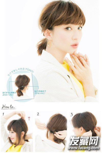 3、将耳前部分的头发往单方向扭转,用手指稍微捏的蓬松些,然后用U形夹固定在马尾的皮筋处。