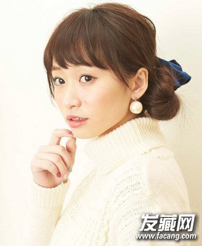 侧边花苞头盘发饱满俏丽,宝蓝色蝴蝶结修饰下更显得甜美可人。