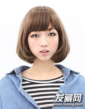 很简单的一款最新韩国女生短发设计,微微偏分的厚重斜刘海造型再与这种中短发形式的发梢内扣烫发相搭,清新自然的栗色染发更添女生的魅力。