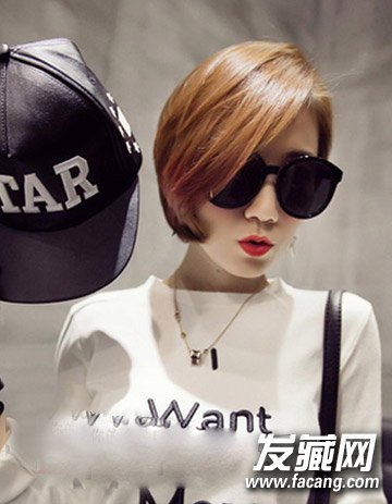 帅气的不对称短发显露出无比的时尚感来,个性的黄棕色发色搭配上墨镜后勾勒出别致的时尚感来,整个造型颇有时尚元素。
