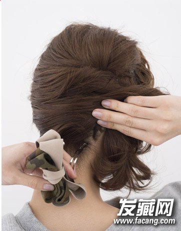 step5:将脑后的头发向上用蝴蝶结发箍固定。