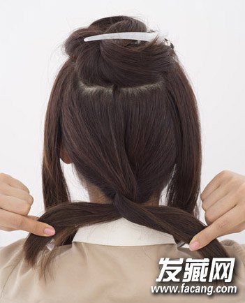 step2:如图留出上方的头发,取出脑后的头发扭转成二股辫。