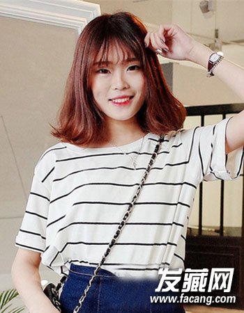 微微内扣形式的韩式空气感齐刘海,再配合时尚的棕红色染发更将女生的肤色衬托得更加白皙红润,简单的齐肩中发