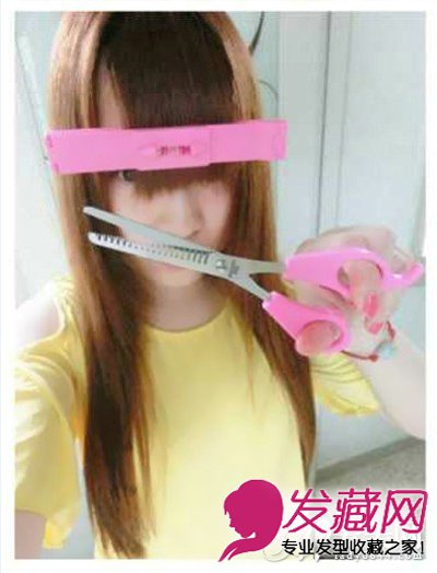 如图所示,把那把头发尺子夹子刘海上,再配合牙剪使用的。