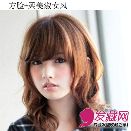 遮盖宽大的额头,搭配鬓角卷发,让方脸打造成小脸,卷发散发浪漫甜蜜气息与柔美淑女风服饰搭配打造出甜美萌妹子。