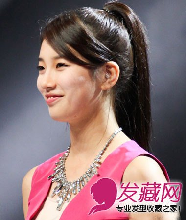 只需要将所有的头发在发顶处扎一个垂顺的高马尾,蓬松自然的造型给人很亲切的感觉,搭配斜刘海发型,更有清新时尚范。