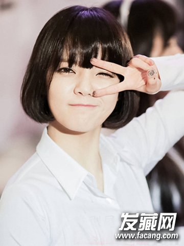 ,齐刘海短发波波头发尾内扣,配合空气感十足的刘海,很有减龄的效果。
