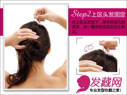 将上区头发放下,用手抓成马尾发束,绕一圈用发夹固定在左侧。