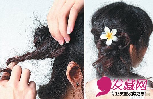 3.在接近右耳根处收尾,用发圈稍加固定后,多余的发尾顺时钟方向绕圈做出小发髻的形状,最后用黑色发夹固定。剩下发丝可统一往右肩前方拉拢,或是随意垂在脑后,夹上一朵本季最时髦的花朵发饰,整个人就像置身巴里岛度假般悠闲。