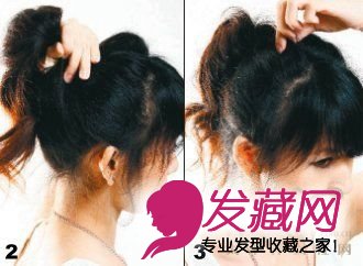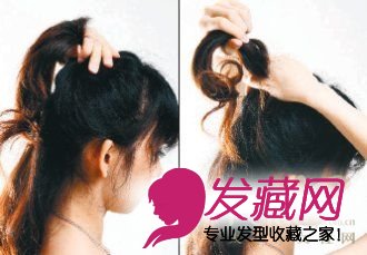 2.把下方的头发往上抓高,高到与前一步骤相同的高度后,用发圈固定并再次提高拉紧。