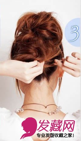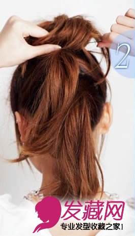 step2先将最上层的头发分成几缕,分别向下方不同角度扭转并固定在发根。