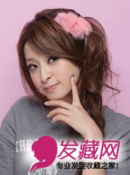 单边的马尾除了可以利用两股捻转发束加强层次感和丰厚度之外,另一侧也可以做点微妙的小变化,把中间那股发束在马尾另一侧扎成花苞发髻,正面看起来会有些微露出的小小可爱感。