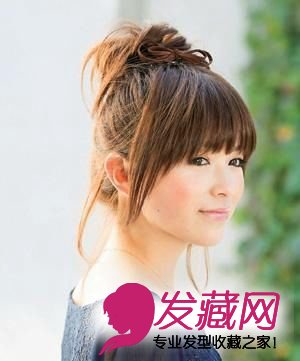 将头发向上梳,用橡皮筋在根部扎成马尾。卷起发尾再扎成发卷。将发卷散开呈丸子状并用发卡固定。