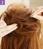 最后将上面剩下的头发也放下来,然后同样用发夹夹在下面的那部分头发上。注意要使头发显得蓬松且头顶显得比较高些。