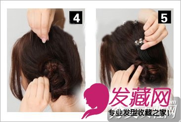 将辫子绕着耳后位置顺时针或逆时针绕成圆发髻,松紧可根据发量多少来调整。发尾部分压到发髻下,用小发卡帮助定型。