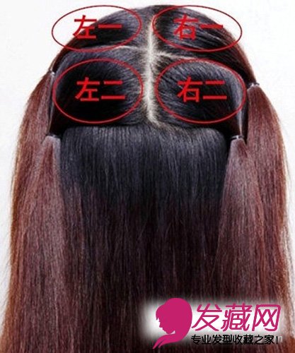 step1:将头发梳理整齐后,以耳朵上方为线,分为上、下两个区,再将耳朵上方区平均分为左二、右二四个区,如图所示方块区。