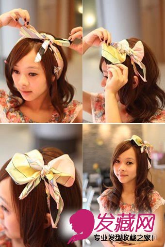 以耳朵为分界线,在耳后嵌入发带,在头顶打结,为增添俏丽感,可在侧面绑上蝴蝶结。