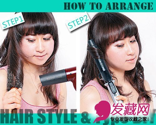STEP1 将头发松松缠绕着圆梳,用电吹风以垂直90度的角度吹卷耳下长发5分钟。