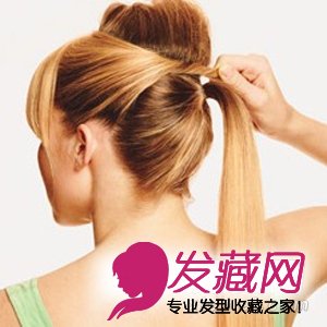 第 5 步把第二部分的发丝拧成一股和马尾辫缠绕。
