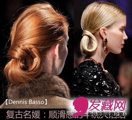 Dennis Basso秀场的这款打结发髻更加松散简单,将马尾向上挽起,随意绕出自然感的弯曲造型,然后打一个活结用发卡帮助固定。非常适合头发较长的女性。创意十足的造型给约会或是宴会场合都能增添更多新鲜花样。